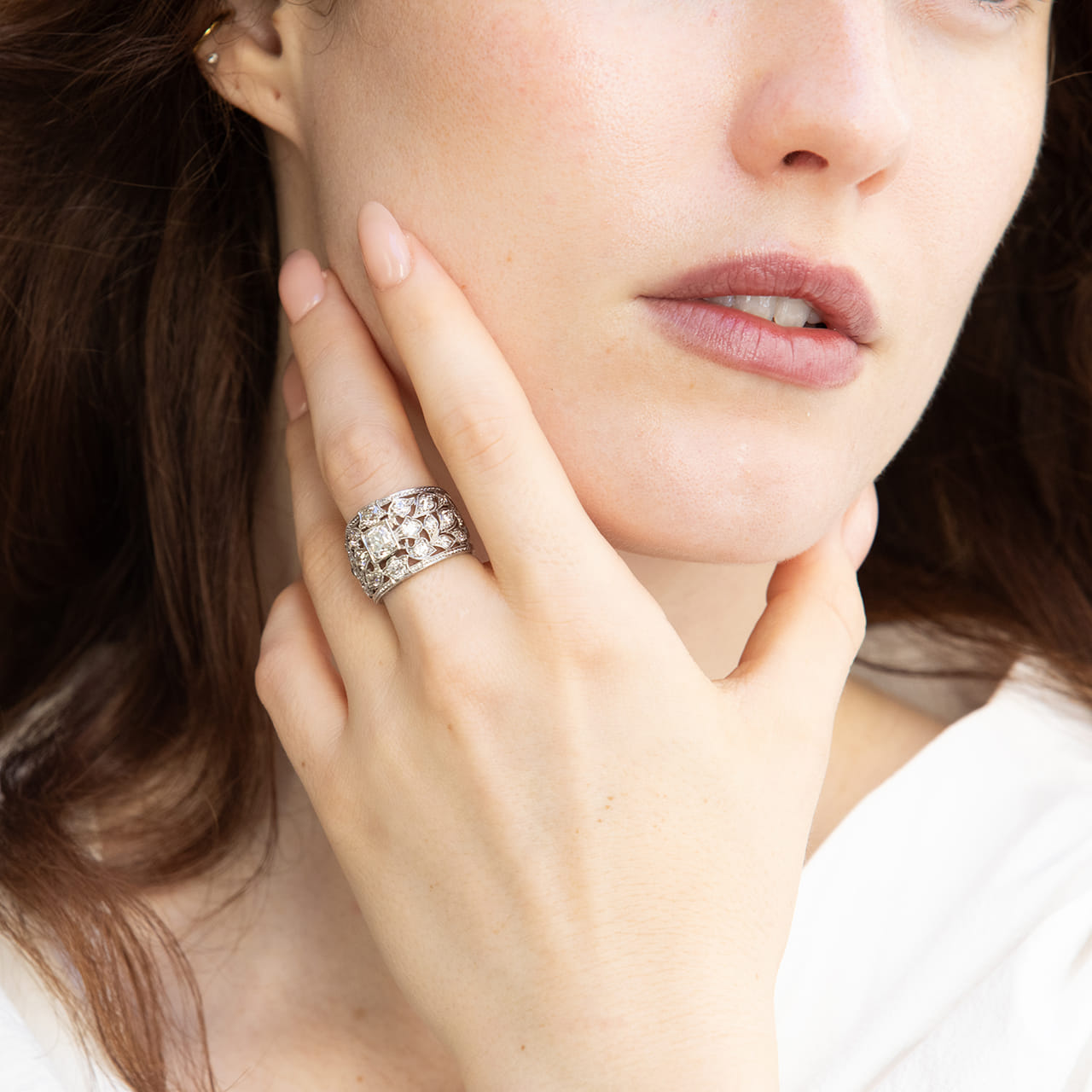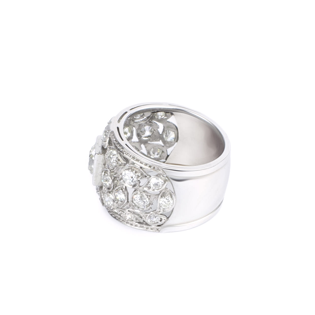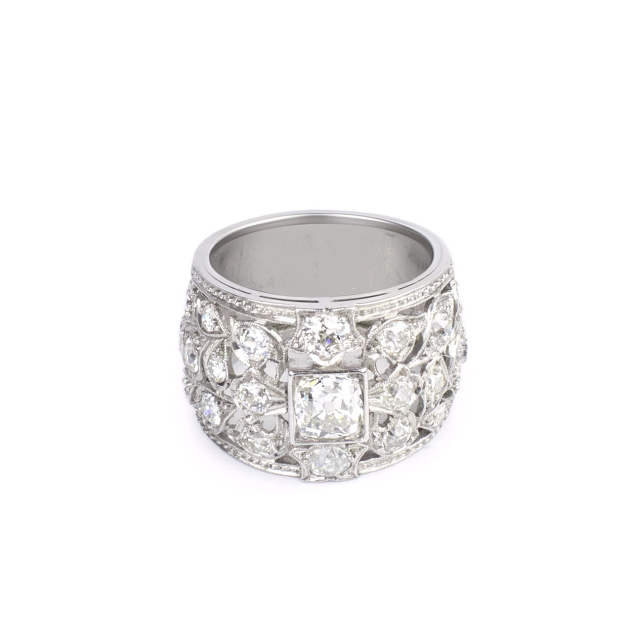 Anello a fascia anni 1930 in platino con diamanti a vari taglie antichi. Diamante centrale 0,90ct a taglio vecchio europa colore J-K purezza SI, diamanti in torno 1,80ct taglie vari– brillante e vecchio europa colore H-I purezza VS-SI.