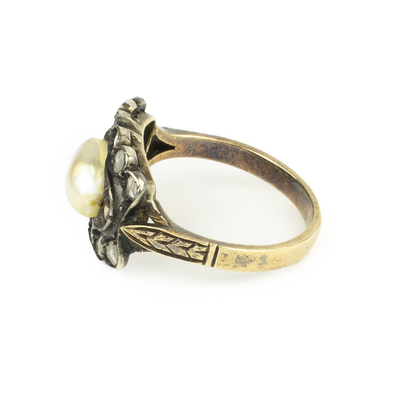 Gli anelli con perle naturali e diamanti, come questo, riflettono perfettamente il gusto Liberty per i materiali preziosi ma delicati. Le perle naturali, spesso non perfettamente sferiche ma di forma ovale o barocca, venivano valorizzate come elemento centrale grazie alla loro lucentezza morbida e romantica. I diamanti, tagliati a rosa, venivano incastonati in montature in oro e argento, creando contorni brillanti ma discreti che esaltavano la perla senza sovrastarla.