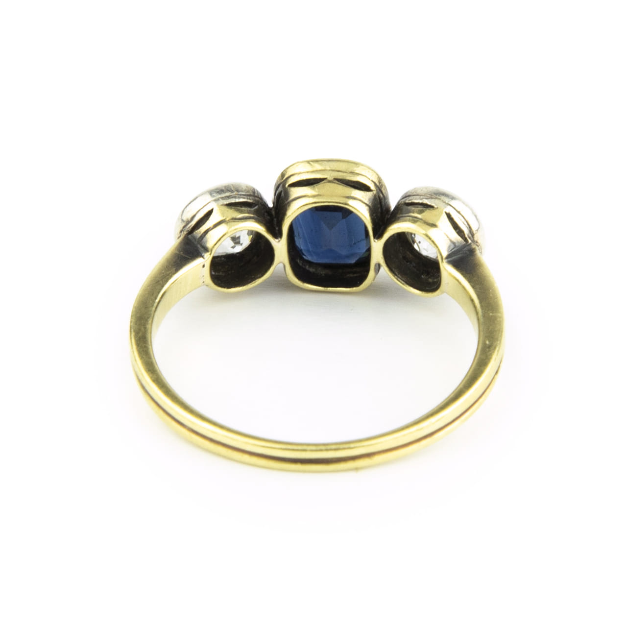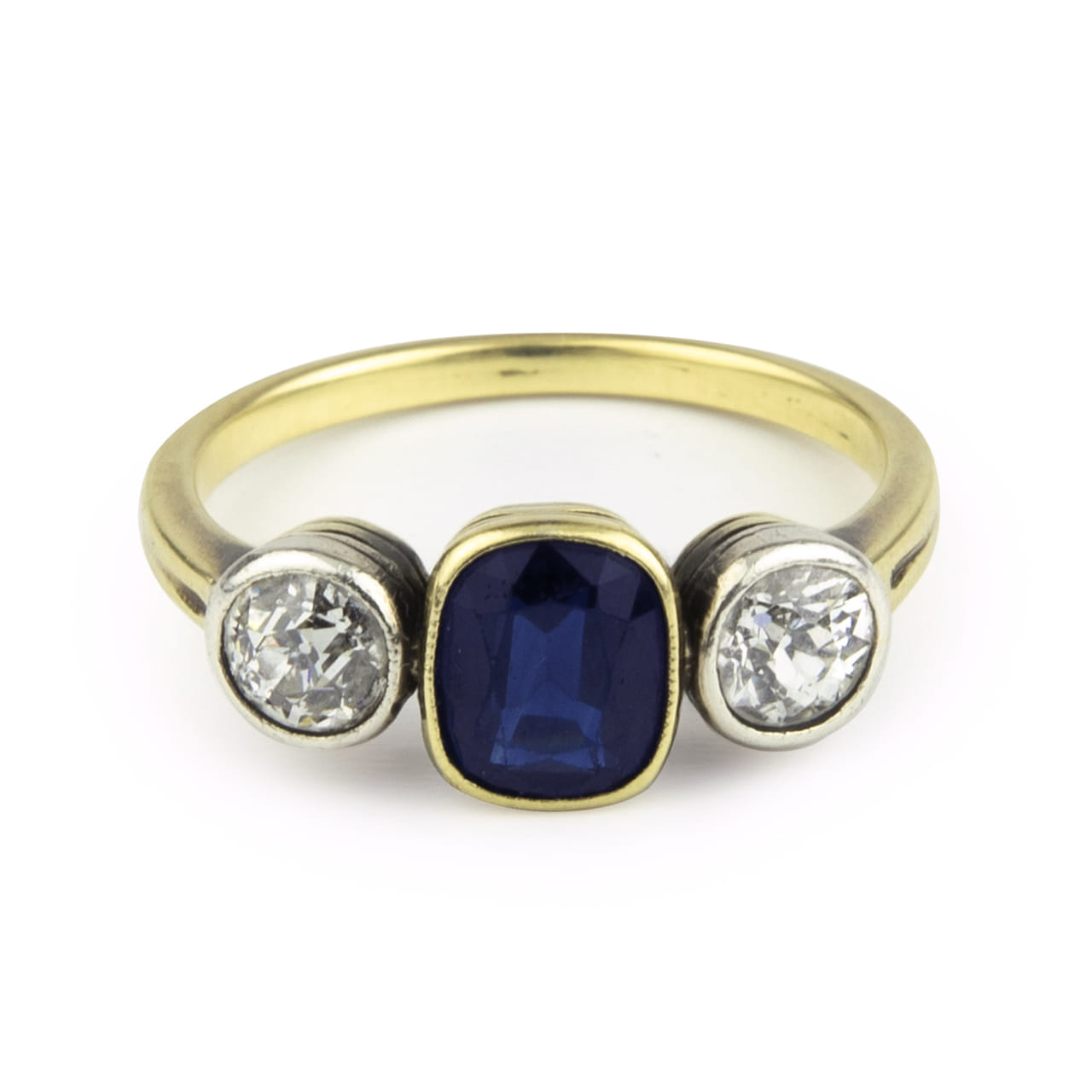 Anello Trilogy Edoardiano in oro giallo 18kt e argento con zaffiro Thailandese no heat 1,40ct e diamanti taglio vecchio europa 0,80ct colore I-J purezza VVS.