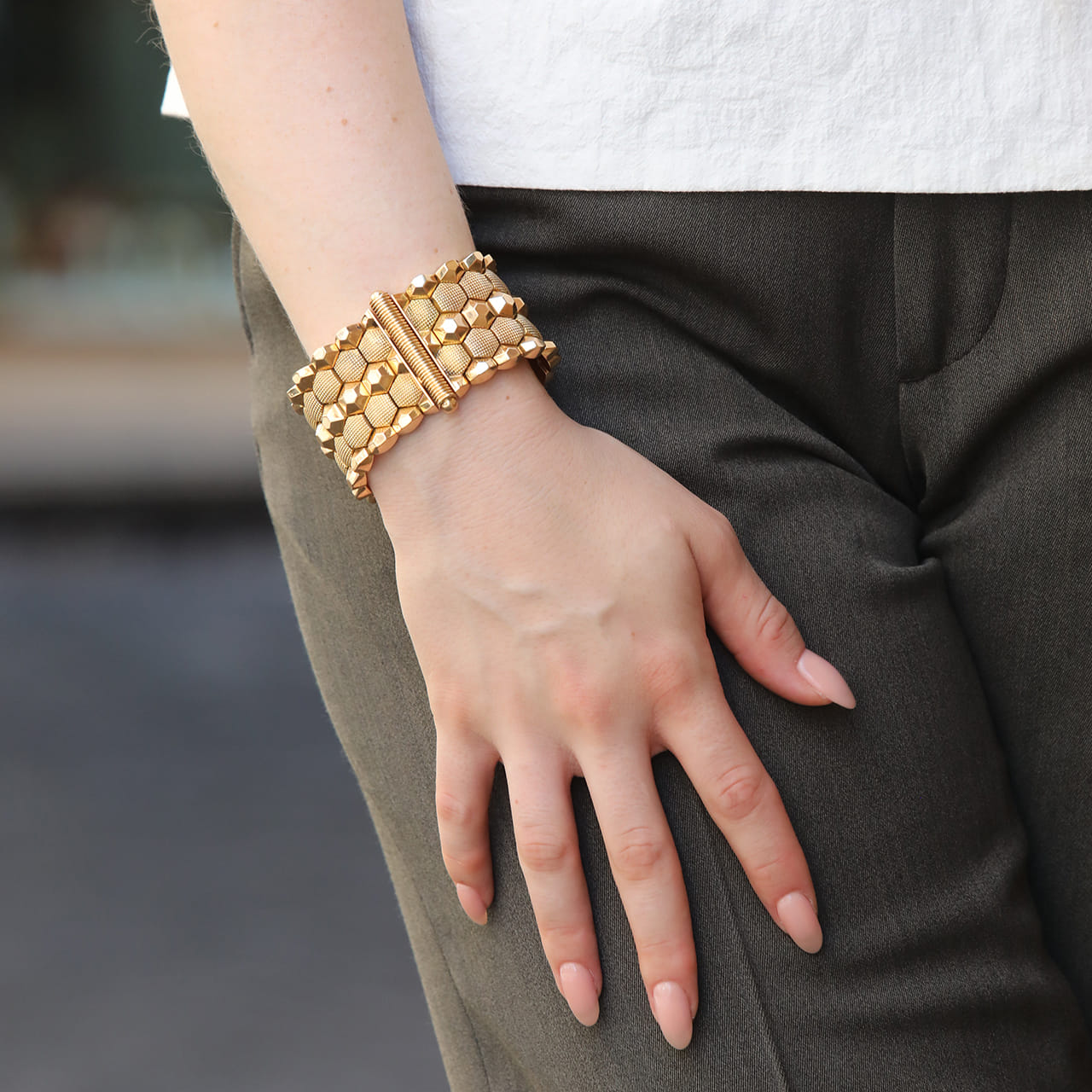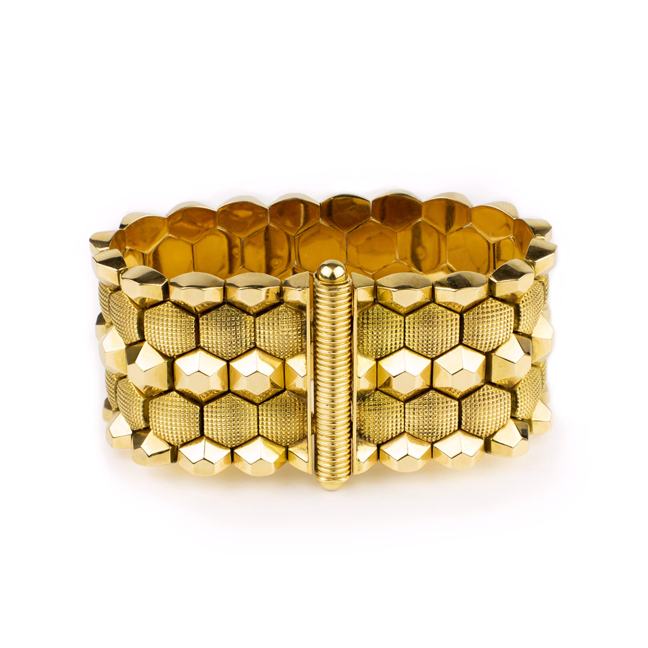 Bracciale a fascia larga anni 1940 nido d’ape in oro giallo 18kt con maglie esagonali, specchiate e opache piramidali con chiusura a scomparsa. Lunghezza 18cm larghezza 3,5cm.