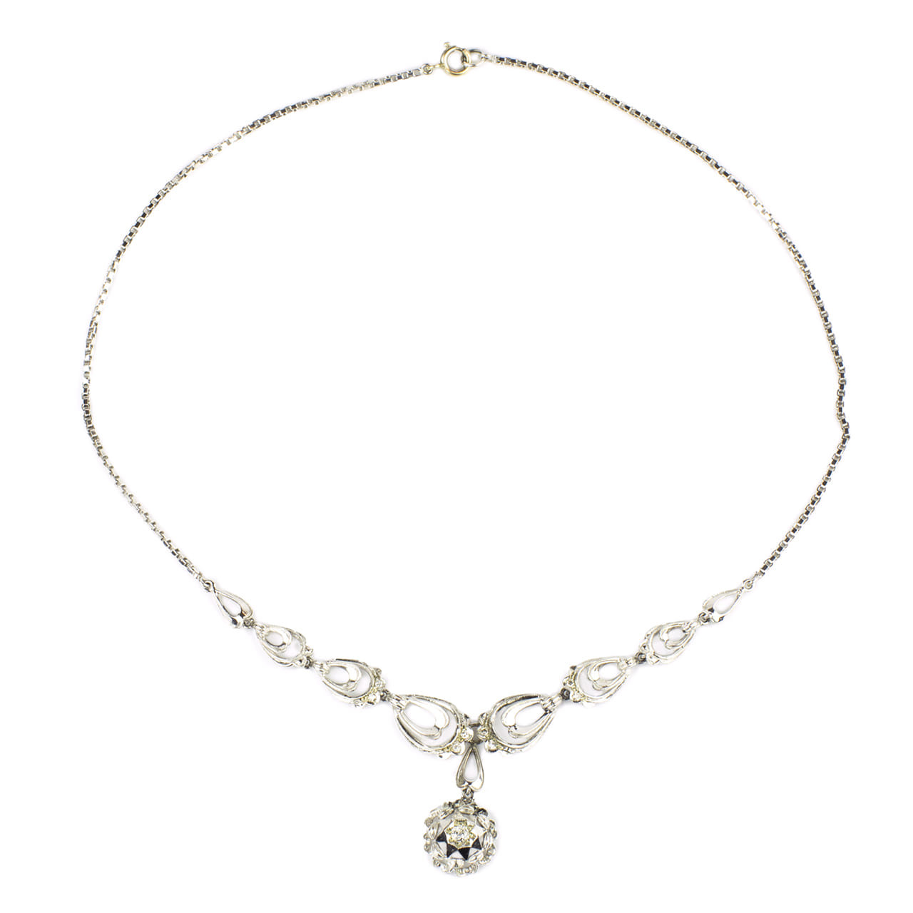 Collana anni 1950 in oro bianco 18kt e diamanti taglio vecchio Europa centrale 0,17ct colore I-J purezza VS e diamanti taglio huit-huit 0,12ct totali. Lunghezza 40cm.