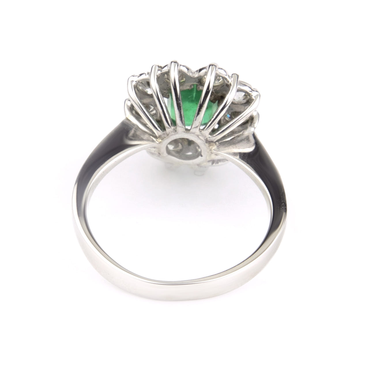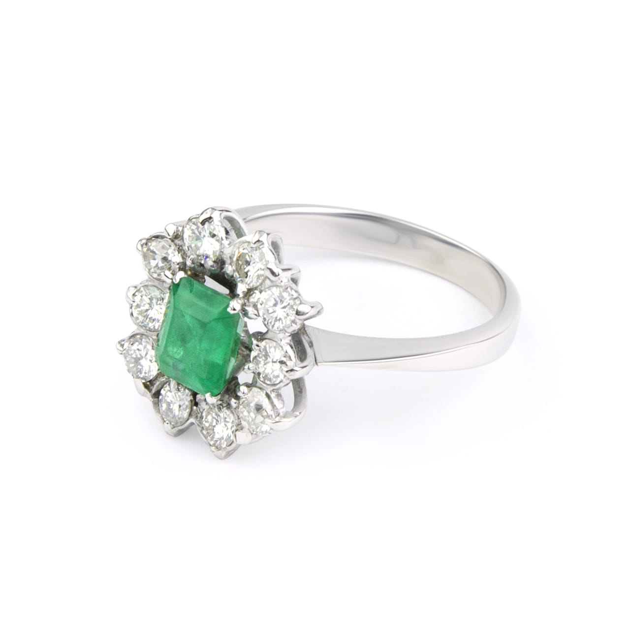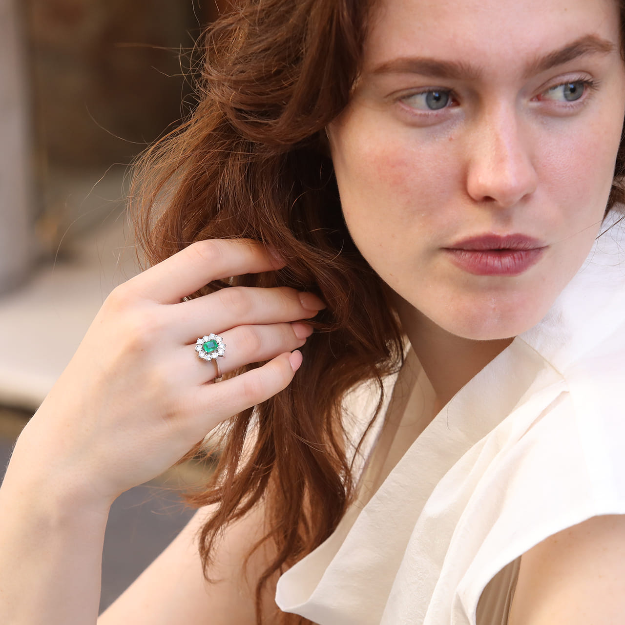 A charming cluster-style ring crafted in 18kt gold and centred with a 0.90 ct Brazilian emerald, surrounded by 0.80 ct of brilliant-cut diamonds color G–H, clarity VS2. Elegant, luminous, and timeless, it captures the delicate balance of vintage romance and classic refinement.