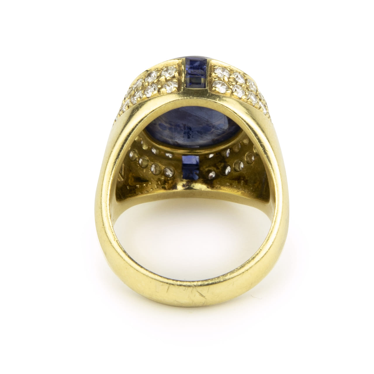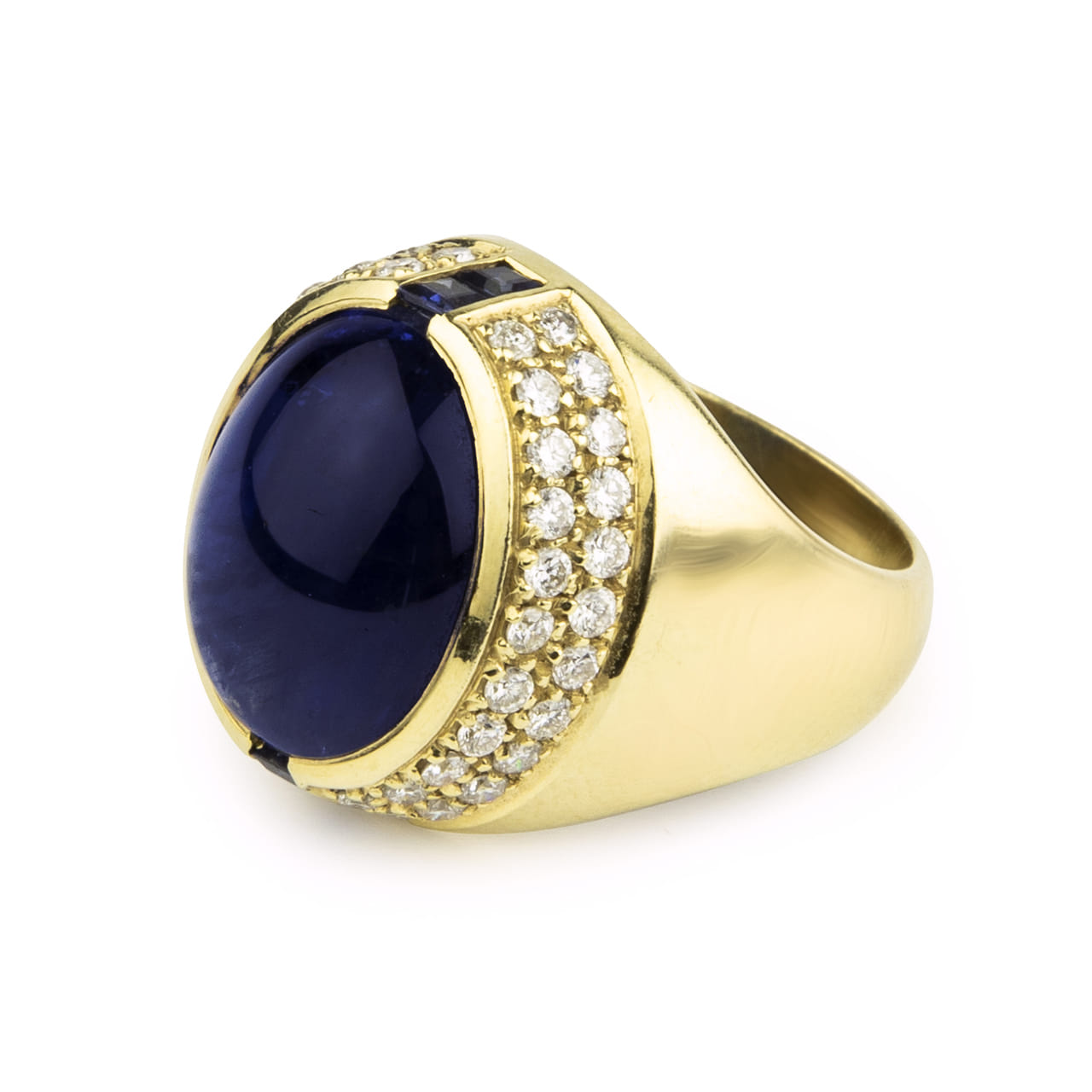 A glamorous 1980s ring in 18kt yellow gold featuring a 14.0ct heated Burmese sapphire cut en cabochon, framed by 1.20 ct of brilliant-cut diamonds (G–H, VS–SI). With its generous volumes and polished gold contours, the design epitomises the powerful, sculptural elegance of the era—luxurious, bold, and undeniably sophisticated.