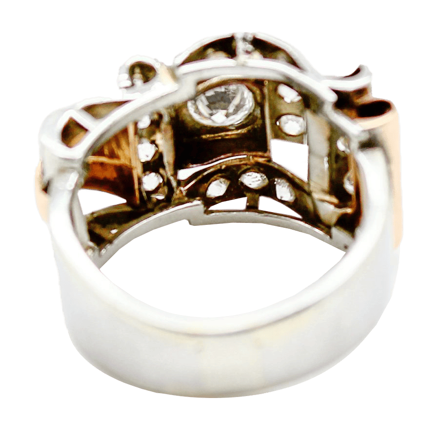 Quaranta witnessed a change in the materials and style of jewellery, influenced by the context of World War II. Platinum became rare, and yellow and pink gold gained more importance. The central diamond, a round brilliant cut, is set in a square frame, reflecting the geometric influence of the Deco era. The design has a stylized, almost mechanical aesthetic-an echo of the last stages of Art Deco, but with more marked volumes and bolder contrasts. This ring was probably a statement piece or a cocktail ring, symbol of wealth, resilience and sophistication. Its architectural structure embodies a perfect fusion of modernism and femininity, with strong lines softened by sparkles and curvilinear accents.