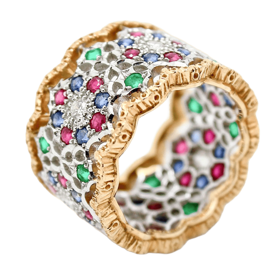 Anello Eternal vintage Mario Buccellati traforato e rifinito a mano in oro bianco e oro giallo 18 kt con diamanti, smeraldi, rubini e zaffiri.