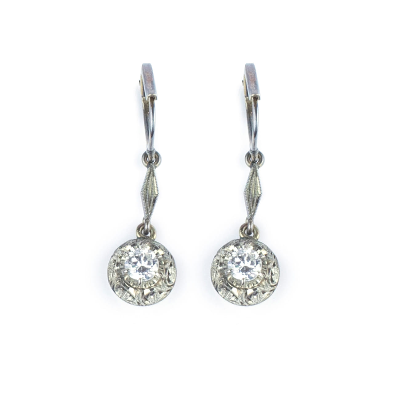 Orecchini Liberty in oro 18kt con diamanti taglio vecchio europa 0,60ct totali color G-H purezza SI chiusura monachina lavorazione a traforo e milligranatura. Lunghezza 3,3cm.