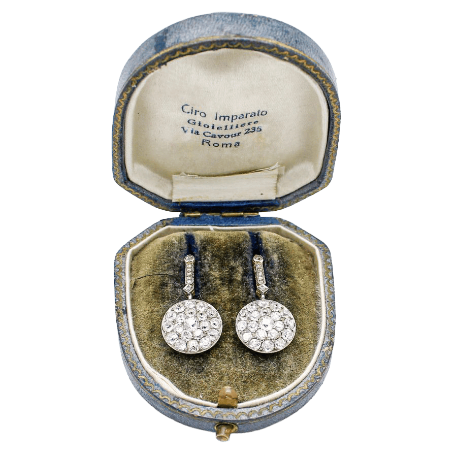 ContattaciOrecchini in stile Art Nouveau impreziositi da diamanti taglio antico. Questi orecchini pendenti hanno la parte inferiore, di forma circolare, traforata e realizzata in oro giallo 18 carati, e la parte superiore in platino.