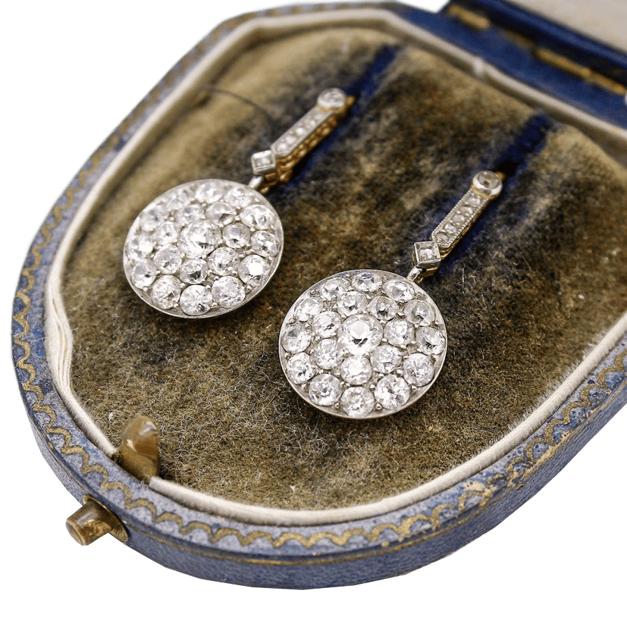 Orecchini pendenti in stile Art Nouveau impreziositi da diamanti taglio antico con base circolare in oro giallo 18 carati e parte superiore in platino.