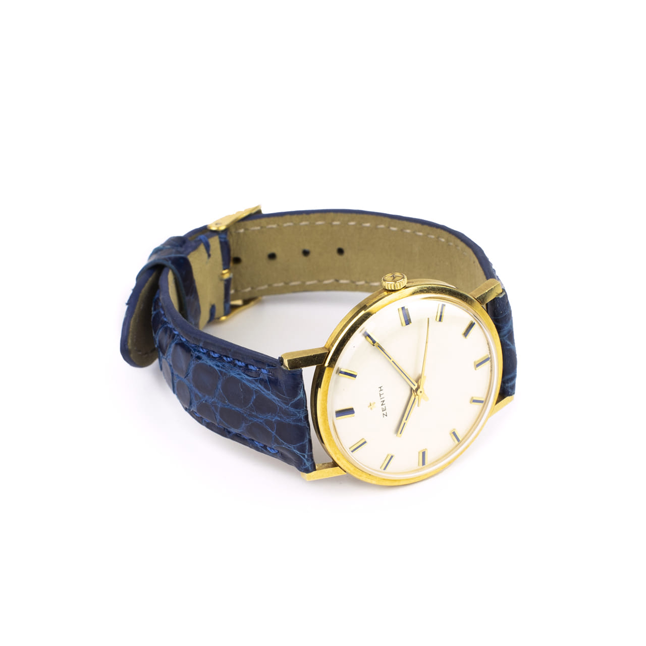 Orologio Zenith in oro giallo 18kt con cinturino in pelle, meccanica carica manuale, diametro 34mm, corona originale Zenith, fibbia in metallo dorato, lunghezza 23cm
