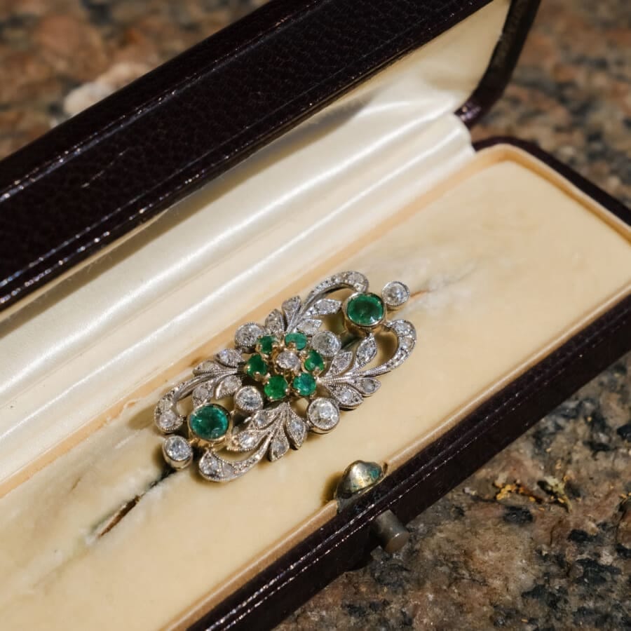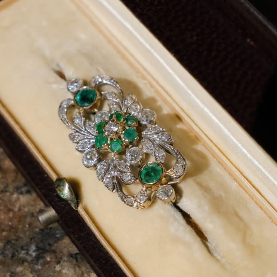 Mentre i motivi floreali erano più comuni nelle epoche Edwardiana e Art Nouveau, i gioielli Deco spesso li reinterpretano in modo nitido e stilizzato, come si vede qui con il fiore centrale di smeraldo circondato da foglie di diamante. I piccoli bordi in rilievo intorno ai diamanti (milgrain) sono un segno distintivo dell’artigianato di alta qualità dei periodi Art Deco ed Edwardiano.True to Art Deco form, the brooch has a symmetrical and balanced layout, incorporating floral and leaf motifsstructured into a defined, ornate design.While floral motifs were more common in the Edwardian and Art Nouveau eras, Deco jewelry often reinterpreted these in a crisp, stylized manner—as seen here with the central emerald flower surrounded by diamond leaves.The tiny beaded edges around the diamonds (milgrain) are a hallmark of high-quality craftsmanship from the Art Deco and Edwardian periods.