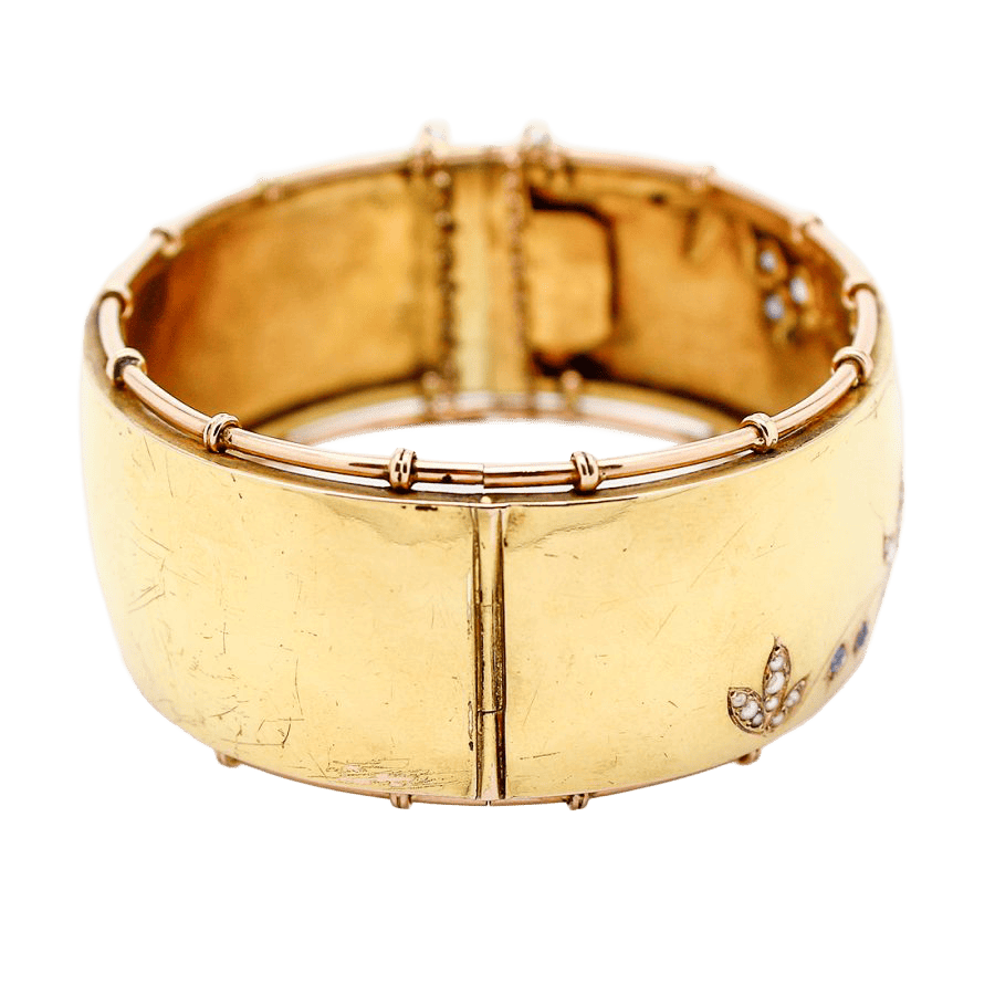 Questo splendido bracciale è un raffinato esempio di gioiello in stile Barbotine o bracciale rigido vittoriano, risalente alla fine del XIX secolo, durante il periodo del Movimento Estetico dell’epoca vittoriana (circa 1870-1890). La superficie è finemente incisa con rami e foglie naturalistiche, impreziosita da minuscole perle e zaffiri blu, una combinazione cromatica molto apprezzata nel tardo periodo vittoriano. Perle e zaffiri: le perle simboleggiavano la purezza, mentre gli zaffiri rappresentavano la fedeltà o la verità, rendendo questi bracciali perfetti come regali romantici o carichi di significato affettivo. Bordi rialzati con cerniera: le finiture applicate lungo i bordi, quasi a forma di bambù, aggiungono tridimensionalità e consistenza, rafforzando al contempo la struttura del gioiello. I gioielli di quest’epoca prediligevano motivi organici, un’estetica spesso asimmetrica e un’enfasi sulla delicatezza piuttosto che sulla grandiosità. Incisioni floreali e gemme incastonate rivelano un gusto per la bellezza botanica e una raffinata femminilità. Questo braccialetto non è solo bello, ma anche ricco di simbolismo e perfettamente rappresentativo della sua epoca, in cui arte, natura e sentimento personale si intrecciavano armoniosamente nel design.