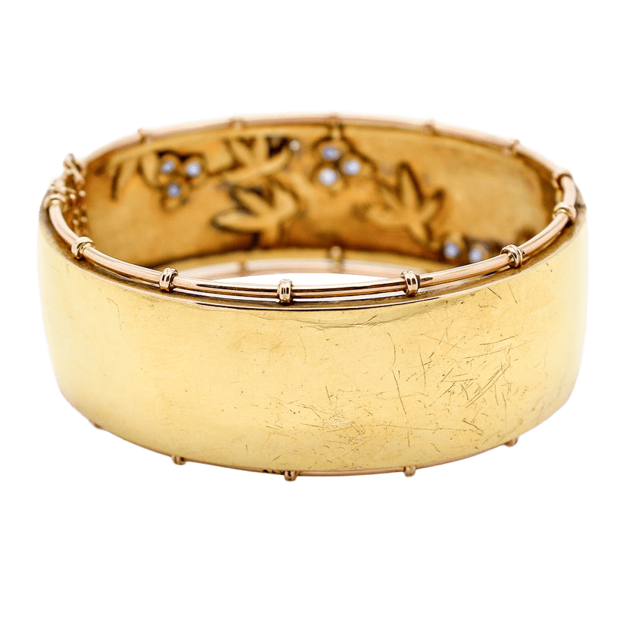 Bracciale rigido di epoca borbonica in oro 18 kt, lavorato a sbalzo e con cerniera laterale. Il frontale è cesellato a mano con motivi floreali decorati con microperle e zaffiri.