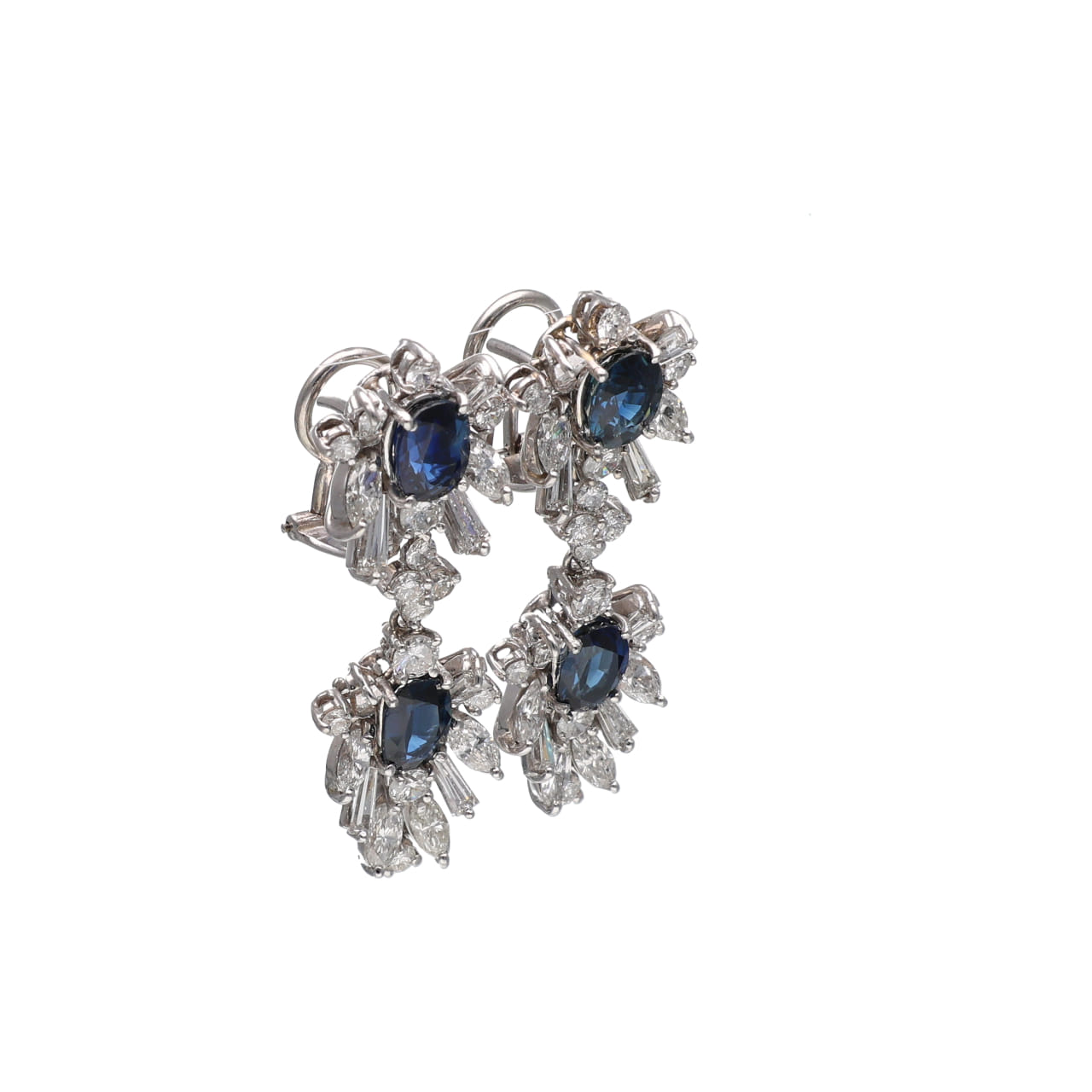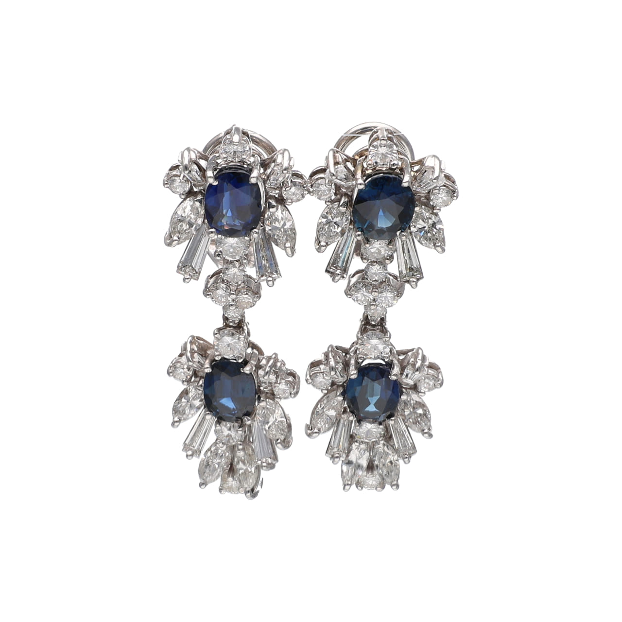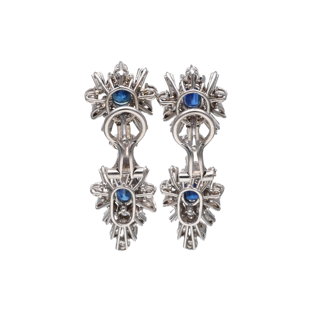 Gli orecchini sono impreziositi da zaffiri naturali di origine thailandese, di formazione magmatica, per un peso complessivo di circa 4,00 carati, dal profondo e intenso colore blu. Intorno agli zaffiri si sviluppa una ricca composizione di diamanti di diverse forme che dona grande movimento e brillantezza al gioiello.