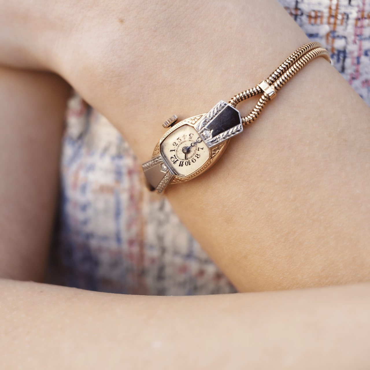 Elegante orologio da polso femminile in stile Retrò, realizzato in oro giallo e bianco 18 kt, caratterizzato da un raffinato design geometrico tipico degli anni ’30-’40.Un orologio-gioiello che incarna perfettamente l’eleganza e la precisione della manifattura orologiera della prima metà del XX secolo, ideale per collezionisti e amanti dello stile vintage.