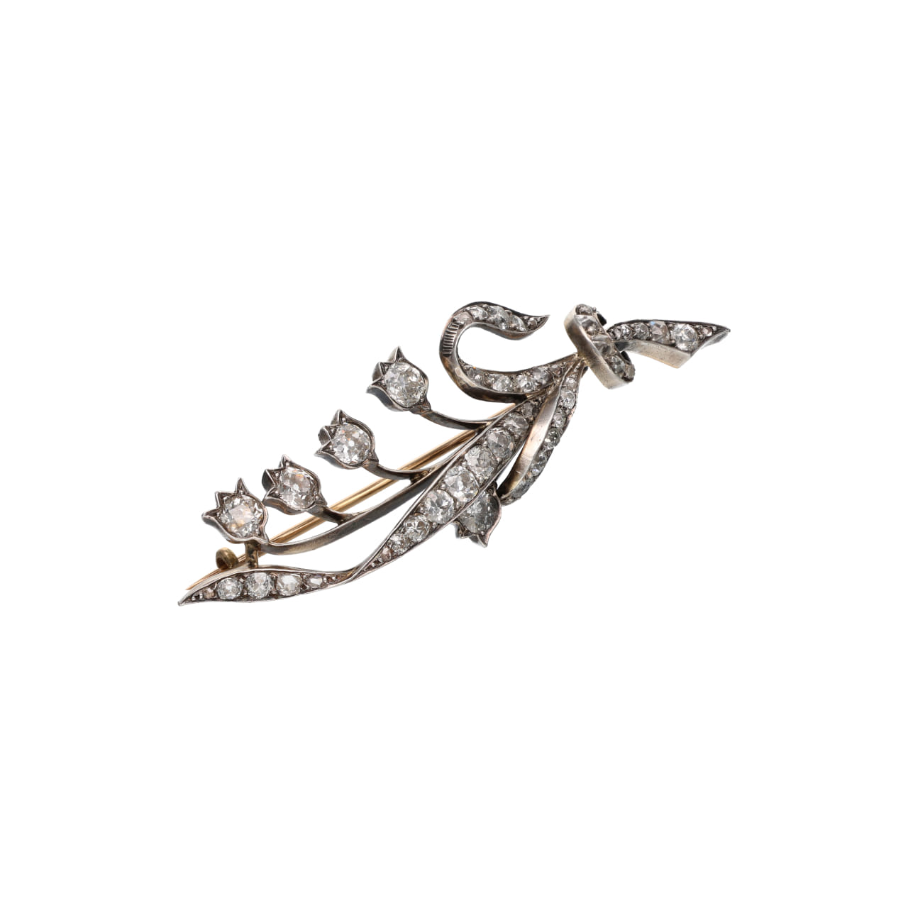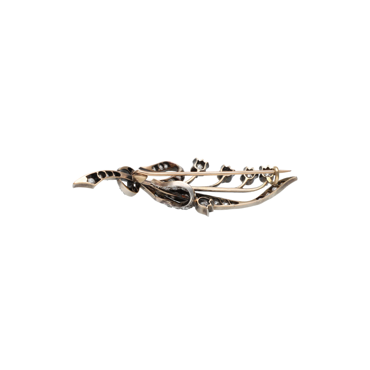 La spilla è interamente decorata con diamanti taglio old mine per un peso complessivo di circa 3,80 carati. Le pietre presentano un colore G–I e una purezza VS–SI, offrendo una brillantezza morbida e vibrante, caratteristica dei tagli antichi. I diamanti sono disposti in dimensioni graduate, seguendo con eleganza le curve del disegno e valorizzandone il movimento.