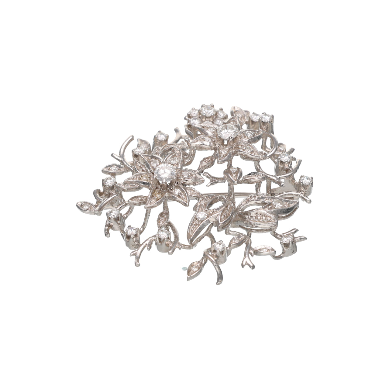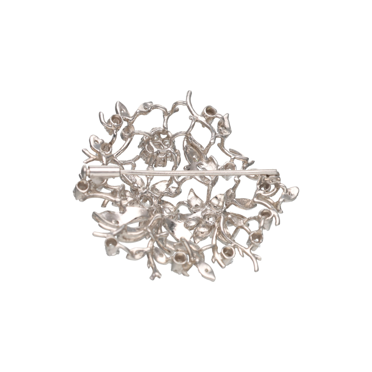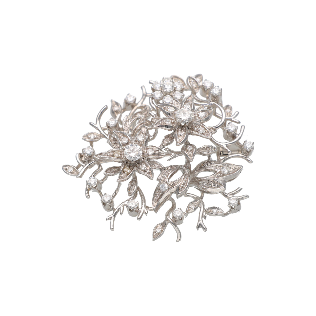 La spilla è impreziosita da diamanti taglio brillante per un totale di circa 1,25 carati, con colore G–I e purezza VVS, che garantiscono una straordinaria luminosità e limpidezza. A questi si aggiungono ulteriori diamanti taglio huit-huit per circa 0,40 carati, anch’essi di qualità comparabile, che arricchiscono la composizione e ne amplificano la brillantezza. Ogni fiore è centrato da un diamante, mentre altre pietre decorano petali, boccioli e fogliame, creando un armonioso gioco di luce.